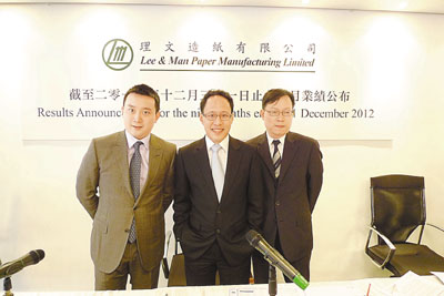 ■左起:理文造紙董事總經理李文斌、首席執行官李文俊、財務總監張國強。 黃子慢 攝