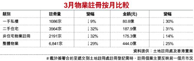 香港文匯報訊 香港置業根據土地註冊處數據指出,3月整體物業註冊錄6,841宗,按月回落近3成(29%);當中一手註冊錄得1,086宗,相比2月1,196宗回落僅9%,為跌幅最少之類別。