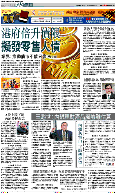 立法會財經事務委員會昨日召開會議,討論年度內提高政府債券計劃發債上限,大部分議員贊成擴大政府債券計劃的規模,經民聯張華峰建議政府發行外幣債券,財庫局副秘書長甄美薇回應稱,政府一向未有限定以港元作唯一的發債貨幣,對人民幣債券的蓬勃發展感到鼓舞,當局將觀察市場發展方向後再作考慮。不過她之後又稱,雖然人民幣債券市場發展迅速,但特區政府發債是為推動本地債市發展,故迄今為止主要發行港元債券。