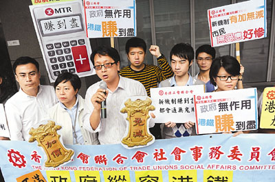 ■工聯會10多名代表在政府總部外請願,要求港鐵凍結加價,將盈利全數回饋市民等訴求。當日,立法會交通事務委員會開會討論港鐵新票價調整機制。 中通社圖