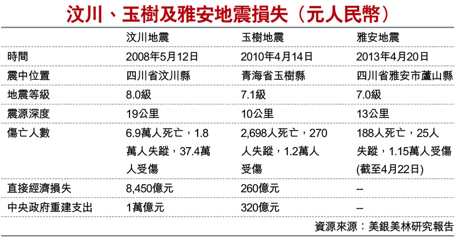汶川、玉樹及雅安地震損失(元人民幣) (圖)