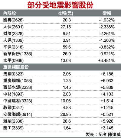 香港文匯報訊(記者 陳遠威)上周末四川雅安地震奪去逾180人生命,截至昨日,據報單資料震央所在的蘆山縣經濟損失已超過294億元人民幣。天災同時亦震散了一眾內險股,太保(2601)及財險(2328)昨分別回吐2.34%及2.26%,國壽(2628)跌1.93%,太平(0966)則受惠母公司注資消息帶動,反升3.481%(見表)。市場預期保險索償增加打擊下,衝擊較大的個別內險股將持續捱沽;相對醫藥類及重建相關概念股份則可望造好。