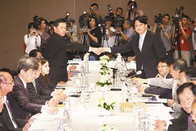 ■台灣「亞東關係協會參事」張仁久(右)與日本交流協會總務部長岡田健一(左)會前代表雙方握手。 中央社