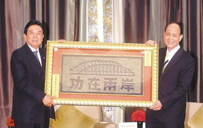 香港文匯報訊 據中新社報道,上月卸任海協會會長的陳雲林(圖左),昨日在台北拜會了台灣海基會董事長林中森(圖右)。會見時,兩人兩度握手,交談甚歡。林中森代表海基會致贈牌匾《功在兩岸》(見圖)。