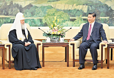 中國國家主席習近平昨日在人民大會堂會見俄羅斯東正教大牧首基里爾。習近平表示,加強中俄全方位戰略合作,可以造福兩國人民,也有利於維護世界和平,促進國際公平和正義。另外,習近平還向基里爾介紹了中國的有關宗教政策。 ■文:本報記者田一涵、新華社/圖:新華社