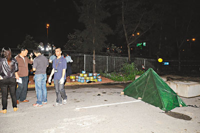 ■探員到場檢走大批疑是賊贓的電線,右邊帳篷掩蓋著死者遺體及殘肢。
