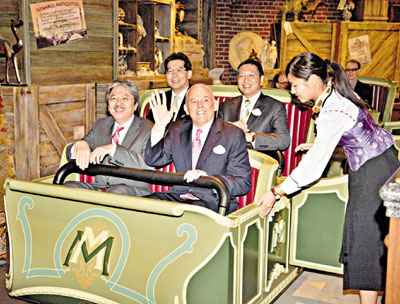 ■曾俊華及蘇錦樑出席「迷離莊園」的開幕禮,並率先試玩「迷離大宅」。 香港迪士尼樂園供圖