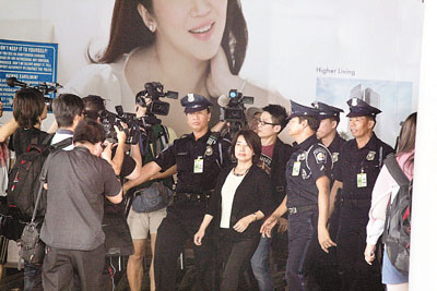 ■台灣調查人員在大批菲律賓警員護送下走出馬尼拉國際機場。 中新社