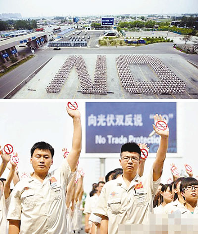 ■中國的光伏企業—英利園區千名員工擺成一個大大的「NO」(上圖)表達對歐盟「雙反」的反對。 網上圖片