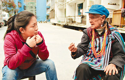 在貢山縣城和兒子一起生活的王彩黛是局部紋面的獨龍族女子。老人下唇邊一條靛青色的圖案已淹沒在歲月滄桑的皺紋裡,若不細看並不容易看出。老人回憶說,自己下唇的圖案是姨媽負責紋的,但自己覺得紋在上唇會更好看。在自己的印象中,獨龍江只有一個鄉的女子是滿面紋的。「紋面疼得人直哭!」想起紋面時的疼痛,時隔幾十年,老人仍忍不住捂住臉不願想起。