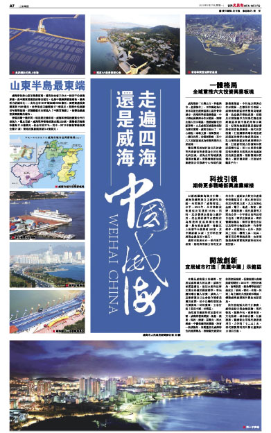 威海市位於山東半島最東端,擁有佔全省三分之一的近千公里海岸線,是中國東部重要的港口城市,也是中國經濟發展最快、最具活力的城市之一。去年全市GDP增加到2338億元,固定資產投資提高到1596億元,全市進出口總額達171億美元,服務外包連續四年實現倍增,所轄縣級市全部進入「中國百強縣」,被譽為最適宜投資創業的城市。