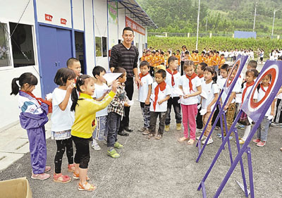為慶祝「六一」兒童節,各地陸續舉辦各式各樣的活動,讓孩子們感受節日的歡樂。四川省蘆山縣蘆陽小學1,600餘名師生昨日在板房校舍裡舉行「少年共建新家園」活動,校園裡充滿了歡笑聲。中新社