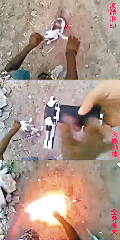 這段30秒短片由一名伊拉克巴格達用戶上載,顯示暴徒在荒地提起小貓,向其背部淋汽油,另一人遞上打火機給他點火。小貓瞬間慘變火球,並衝入一堆樹葉,叫聲愈來愈弱。男子不僅未收手,還笑著追去。 ■《星期日鏡報》