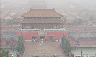 ■昨日下午,北京城區突降大雨,並伴有冰雹。圖為大批遊人滯留在故宮北門城門下避雨。 中新社
