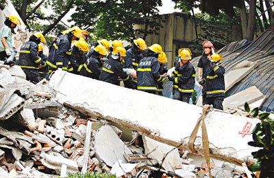 ■昨日,江蘇蘇州燃氣集團橫山儲罐場生活區綜合辦公樓一樓職工食堂廚房發生爆炸致大樓倒塌,造成11人死亡。圖為消防員搶救出一名被埋人員。 新華社