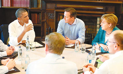 ■(左起)奧巴馬、卡梅倫和德國總理默克爾在G8峰會會晤。路透社