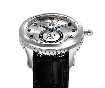 COLVMBVS™ Grande Date GMT腕錶內的Technotime 651機芯之美,在清澈透明的藍寶石水晶錶背下一覽無遺,同時錶背上刻著航海家哥倫布的頭像線條,藉此彰顯其勇敢的冒險精神。亮銀色的精鋼錶殼配以黑色鱷紋真皮錶帶,銀色光面錶盤清晰展示GMT世界時間,再襯以扭索式的太陽飾紋圖騰、磨砂中央錶圈及圓形的拉絲秒計器,三者互相輝映,結合成兼具堅固穩定與復刻優雅造型的腕錶。大日期於12時位置以兩個小盤顯示,秒針更綴以藍色細緻的CHARRIOL標誌,意味著創新設計與精緻製作工藝的融合。此腕錶於全球限量發售300枚,更能突顯男士的尊尚品位。