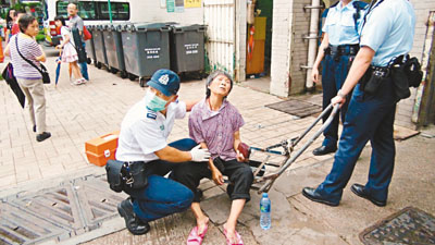 拾紙皮的「阿蓮」情緒激動,坐在手推車上由救護員即場檢查。