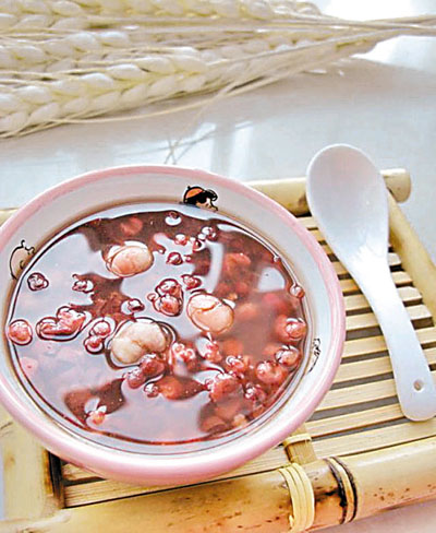 做法:準備同等分量的紅豆和薏米,洗乾淨後,紅豆泡兩至三個小時,薏米泡一個小時,大米洗乾淨後,泡半個小時,備用;在沸水中加入紅豆,煮開後,添一些涼水,再煮開後,再添涼水。紅豆煮開花後,放入大米和薏米,大火煮開後,轉小火煮至黏稠,就放冰糖調味即可。