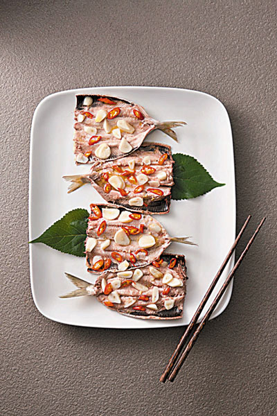 材料︰沙甸魚或熹靈魚4條(約300克)、初榨橄欖油2湯匙、蒜蓉1湯匙、紅辣椒1個(切碎)、粗鹽1/2茶匙