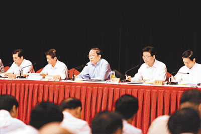 ■昨日,俞正聲率工作組抵達烏魯木齊,召開全區黨政幹部大會,研究落實當前維護新疆社會穩定、維護各族群眾利益具體措施。 新華社