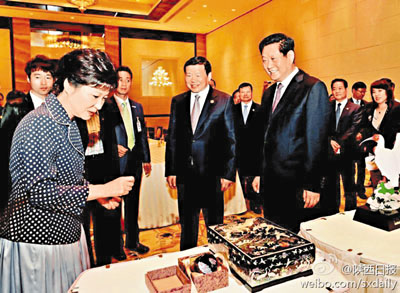 ■6月29日晚,陝西省委書記趙正永和省長婁勤儉會見了朴槿惠一行。雙方互贈了象徵兩國人民友誼和充滿本民族文化特色的紀念品。網上圖片