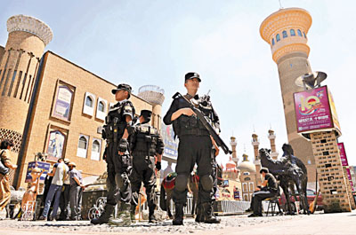 ■昨日,遊客眾多的新疆烏魯木齊市國際大巴扎,一隊特警持槍在此執行警戒任務。 中新社
