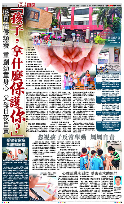 近來,內地女童校園被猥褻的案件頻頻見諸媒體,除了這宗「深圳曝光一名教師猥褻4名8歲女童長達一年」,還有海南萬寧校長帶6名女學生開房多宗校園性侵案。事發逾個月後,記者回訪發現,廣東深圳4名女童在遭受劫難後性情大變,自卑、脆弱、敏感取代了兒童該有的天真活潑。4對年輕的父母日夜自責,千方百計逃離過去的生活,他們說得最多的一句話是:「我很害怕,我已經不懂怎麼教育孩子了。」人們在痛心、惋惜,議論紛紛的同時,也在詰問著社會:對於在校兒童,我們哪些方面做得還不夠?為什麼兒童在校園裡還會受到侵犯?誰來保護孩子們的權益?