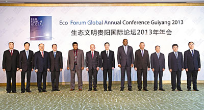 ■出席生態文明貴陽國際論壇2013年年會開幕式前,張高麗與出席會議的中外嘉賓合影。 新華社