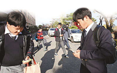 ■韓國青年沉迷智能手機的情況日趨嚴重,不少中學生放學後都第一時間拿出手機上網。美聯社