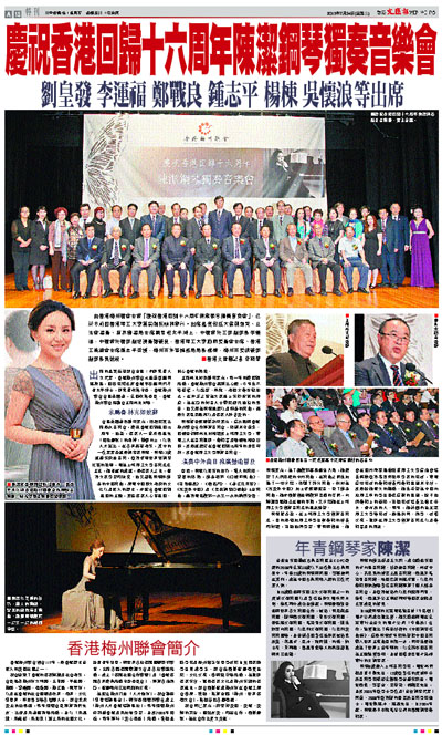 由香港梅州聯會主辦「慶祝香港回歸十六周年陳潔鋼琴獨奏音樂會」,已於日前假香港理工大學蔣震劇院順利舉行。出席嘉賓包括大紫荊勳賢、立法會議員、新界鄉議局主席劉皇發太平紳士,中聯辦社工部副部長李運福,中聯辦社聯部副巡視員鄭戰良,香港理工大學顧問委員會主席、香港工業總會主席鍾志平教授,梅州市外事僑務局局長楊棟,梅州市委統戰部副部長吳懷浪。 ■香港文匯報記者 韋珮華