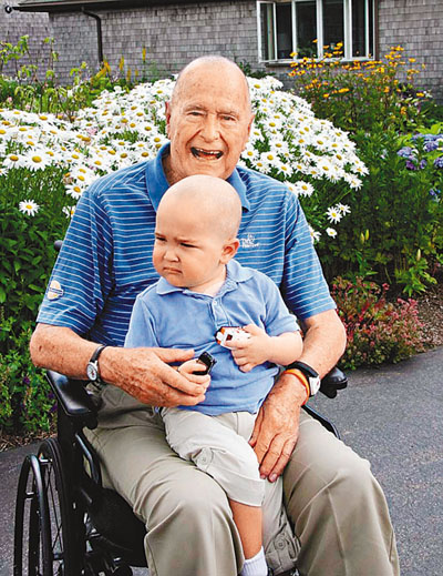 89歲的美國前總統老布什為鼓勵一名密勤局保鑣患血癌的2歲兒子帕特里克,毅然剃光頭上僅餘的髮絲,並捐款支持小孩繼續接受治療。 法新社/美聯社
