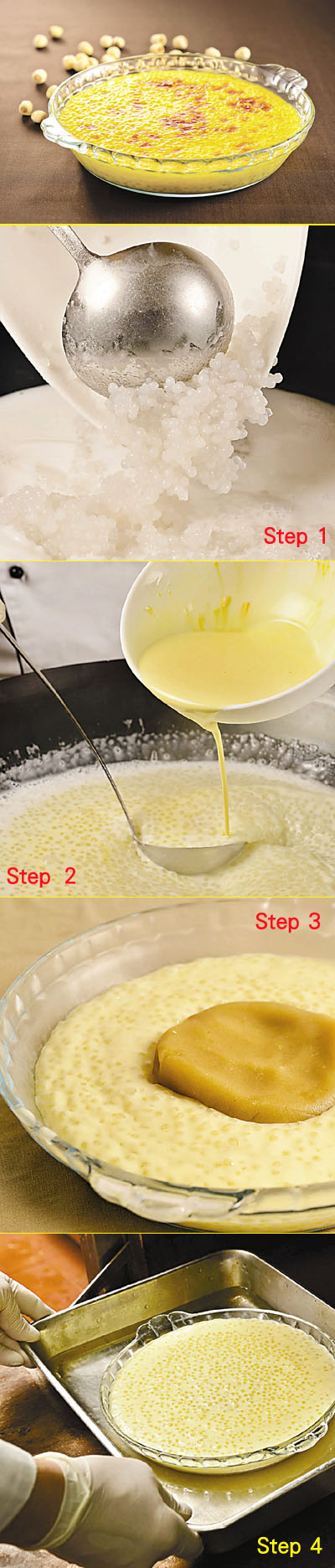 Step 3:把一半西米放在焗碟上,中間鋪上蓮蓉,再放上餘下西米鋪平。