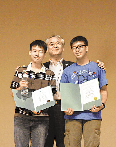 ■中華基金中學的羅俊傑同學(右)及黃智琛同學(左)於會議上擊敗與會的其他54隊代表,勇奪科研項目金獎。