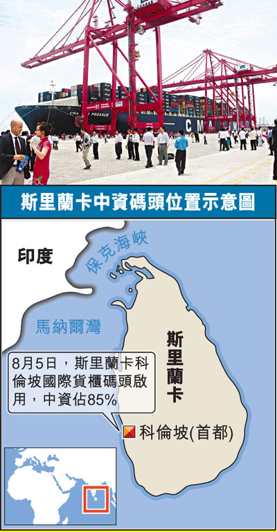 香港文匯報訊 據法新社報道,中國在斯里蘭卡投資5億美元(約合港幣39億元)援建的大型貨櫃碼頭昨日正式啟用。在全世界最繁忙的國際海運航線上,中國又獲得一個重要立足點。