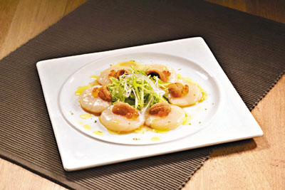 洋風北海道帆立貝,同時呈現薄切帆立貝刺身的鮮甜爽口、海膽的香滑甘甜及魚子的鮮美;伴碟的紫蘇汁,進一步提升三者鮮味。