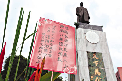 台南市日前擬拆遷湯德章紀念公園內一座近40年歷史的孫中山銅像,意外引發當地政壇藍綠對峙!國民黨台南市議會黨團及台南市黨部強烈抗議,痛批市長賴清德借市政之名行政治清算之實。台南深綠民眾則認為該公園是紀念在台灣「二.二八」事件中被無辜殺害的台南知名政治人物湯德章,孫中山銅像「不符合主題」,理應搬走。銅像旁有孫中山孫女孫穗芳給銅像保衛人士的感謝詞。 ■中央社