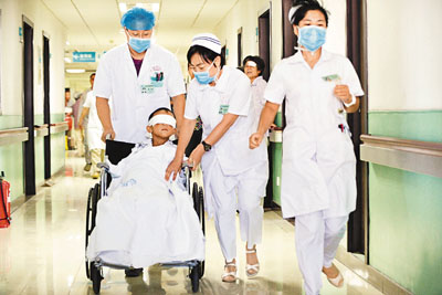 ■被挖雙眼男童郭斌昨日換藥完畢返回病房。 中新社
