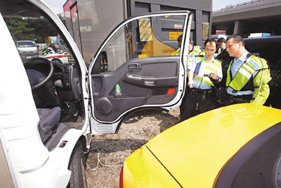 受傷貨車司機姓黃、48歲,感到胸痛,幸送院救治無大礙。現場為觀塘敬業街65號一個露天停車場,事發昨午1時許,黃到露天停車場擬取車開工,有感貨車的駕駛室在烈日下被曬酷熱,故打開車門散熱,並口叼香煙站在車外伸手入內「撻車」,卻不察上手司機已為車入了「後波」,當貨車引擎啟動之後即猛然後衝2個車位,黃避無可避被夾在貨車與另一輛私家車之間被困受傷。