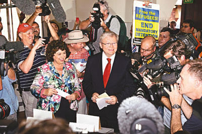 陸克文和阿博特昨日先後到所屬選區的票站投票,不約而同遇上示威,阿博特在票站外被大批示威者包圍,被迫取消原定最後一場公開亮相活動,但在悉尼市中心四季酒店舉行的慶功晚會則如期舉行。