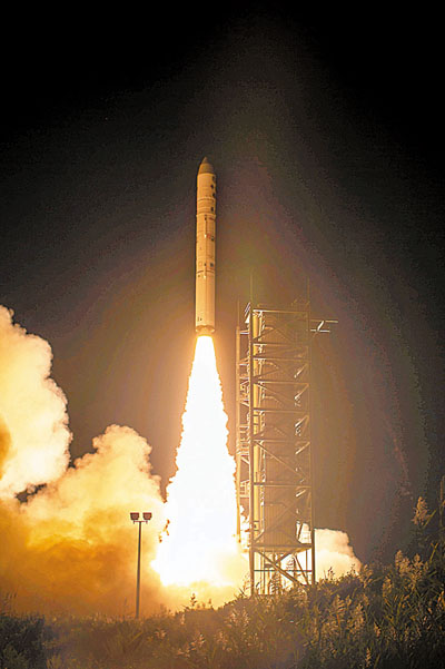 由退役空軍彈道導彈改裝而成的「米諾陶5」號火箭,前晚在弗吉尼亞州發射,將「月球大氣與粉塵環境探測器」(LADEE)送入太空。LADEE體積如一輛小汽車,利用太陽能和鋰電池提供動力,造價2.8億美元(約21.7億港元),定於30日後進入月球軌道,完成任務後,將墜落月球表面報銷。■路透社/綜合外電消息
