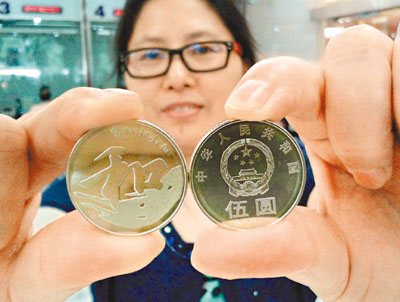 中國人民銀行「和」字行書普通紀念幣23日開始發行。紀念幣正面主景圖案為中華人民共和國國徽,內緣上方刊「中華人民共和國」國名、下方刊面額「伍圓」及年號「2013」;背面主景圖案為「和」字的行書書法,襯景圖案為書法的飛白,內緣右上方刊「和」字的五種書法體。該紀念幣面額為5元,材質為黃銅合金,發行數量為5000萬枚。由於該幣具有一定的收藏價值和觀賞性,引發了收藏愛好者和普通市民的極大興趣,被瘋搶一空。 中新社