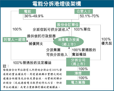 至於建議以信託形式分拆出的港燈,她則指吸引力不及電能,對一些非常保守投資者而言,港燈穩定的業務與派息是僅餘的優點。公告表示港燈日後的所有純利,全數用以派息,料可吸引一班純靠收息的投資者認購,但招股價需要多一點折讓。
