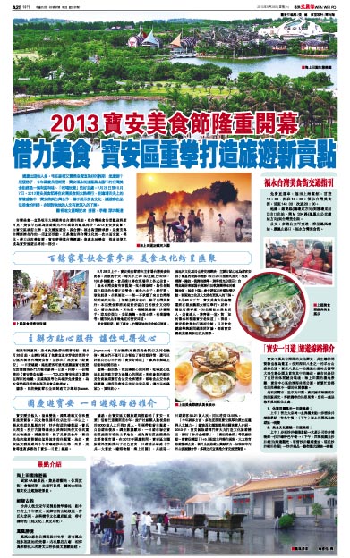 國慶出遊怕人多,宅在家裡又覺得浪費這美好的假期,怎麼辦?別發愁了,今年國慶長假期間,寶安福永街道鳳凰山腳下的台灣美食街將是一個有滋有味、「吃喝玩樂」的好去處。9月28日至10月7日,2013寶安美食節將在台灣美食街火熱舉行,在這場舌尖上的饕餮盛宴中,寶安將與台灣合作,聯手展示美食文化,讓遊客在品位美食的同時,亦能對兩地的人文有更深入的了解。 ■香港文匯報記者 孫雪、李薇 深圳報道