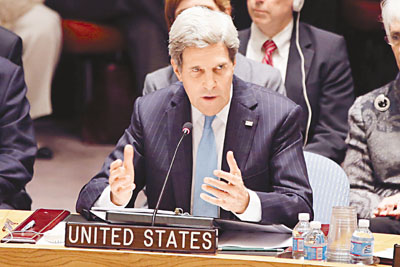 ■美國國務卿克里向中國發表國慶賀詞。圖為他在美國時間27日出席聯合國安理會會議。美聯社