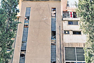 ■中國駐敘利亞大使館一座受損建築內,有人在向外張望。新華社