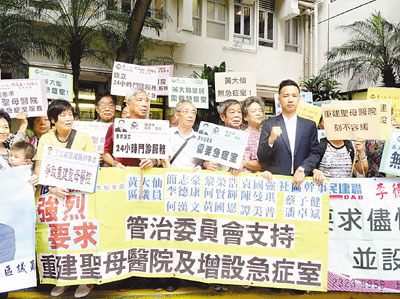 民建聯黃大仙支部昨日聯同約100名街坊,趁聖母醫院管治委員會開會前,向醫管局代表遞交請願信,要求盡快重建聖母醫院及增設急症室。代表指,聖母醫院重建計劃早在4年前已被批出,但現時仍未有回音,他促請當局盡快為重建提交時間表。 ■記者 陳錦燕