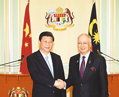 對習近平提出的上述建議,納吉布在會談中表示,他完全贊同中方合作建議,認為這些設想意義重大,將推動兩國關係取得更大進展。馬方希望同中方保持各層級溝通,擴大雙邊貿易,促進相互投資,建設好欽州和關丹兩個產業園區,亦歡迎中國企業參與馬方基礎設施建設,鼓勵雙方互設金融機構。此外,馬方完全支持中方倡議籌建亞洲基礎設施投資銀行並願意考慮參加。