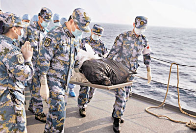 ■昨日,中國海軍和平方舟醫院船在西沙琛航島附近打撈起一具遇難漁民遺體,船上軍人將其運往太平間。中新社