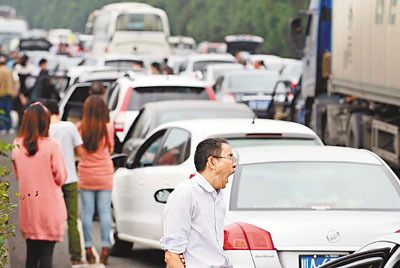 ■黃金周在四川成雅高速擁堵路段,人們在等待通車。網上圖片